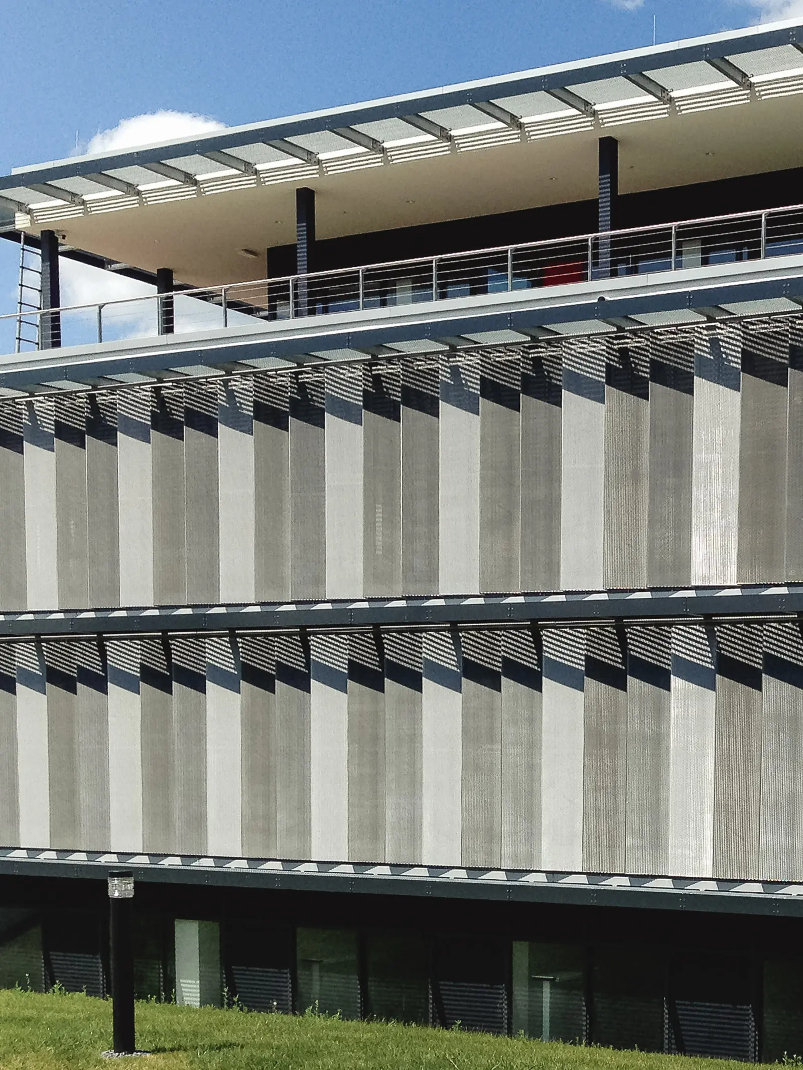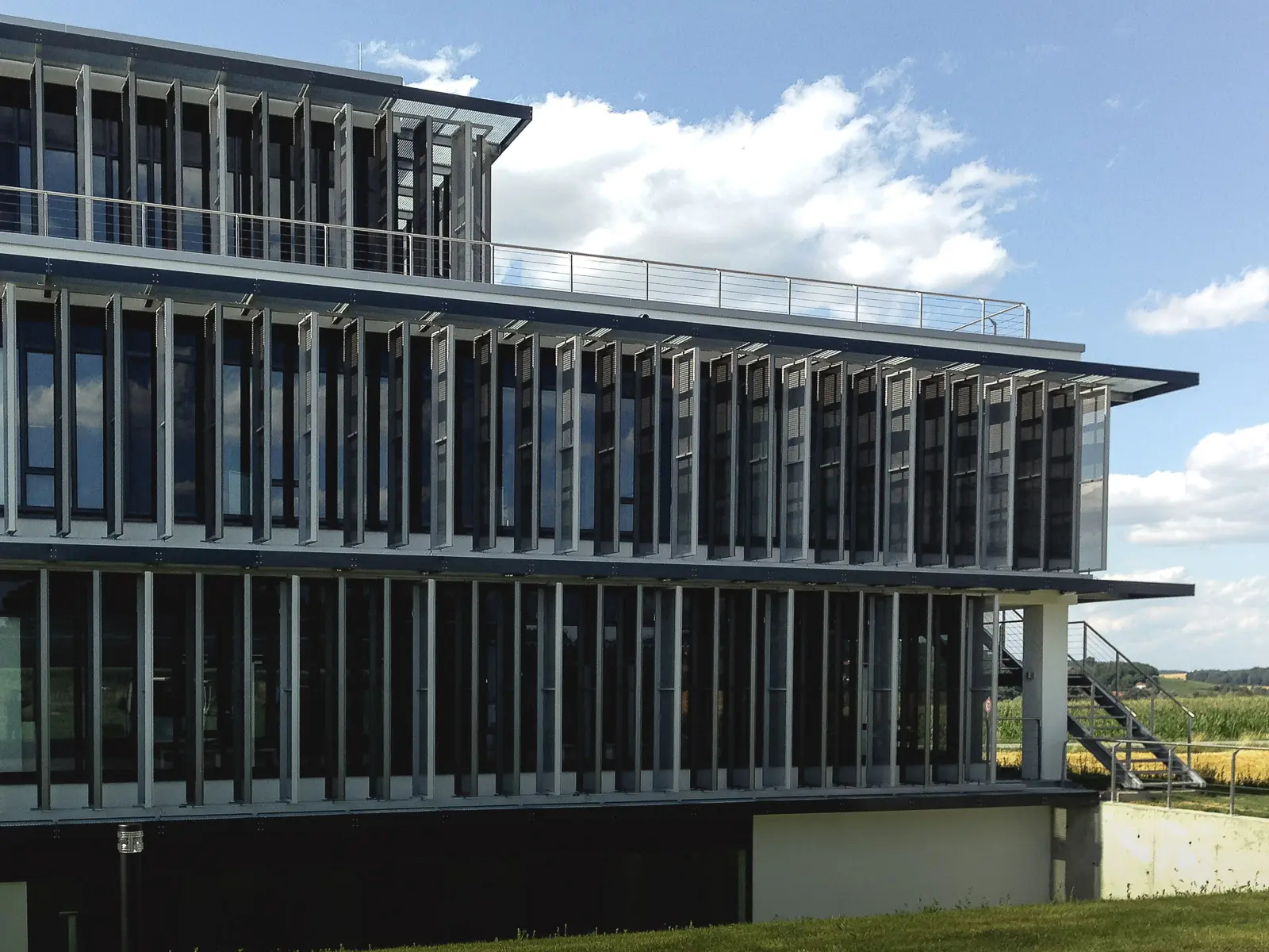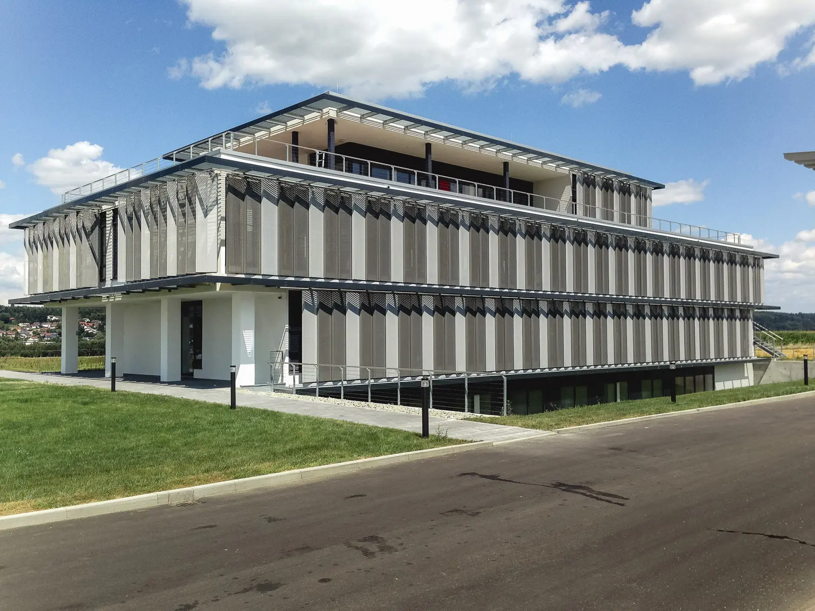 Das Bürogebäude in Pfarrkirchen erstreckt sich über vier Geschosse und bietet Platz für zentrale Besprechungs-, Konferenz-, Sozial-, Archiv- und Lagerräume sowie einige Dutzend Einzel- und Mehrplatzbüros. Den Sonnenschutz auf der Ost-, der Süd- und der Westfassade gewährleisten vertikal angeordnete, transluzente Großlamellen mit einer Streckmetallbespannung. Diese werden auf der Südseite im Erdgeschoss, im ersten Obergeschoss sowie im Konferenzbereich im zweiten Obergeschoss automatisch positioniert. Abhängig von der Außenhelligkeit wird die Nachführung nach dem Sonnenazimut aktiviert. Das gewährleistet das blendfreie Arbeiten an den Bildschirmarbeitsplätzen oder bei Präsentationen. Über einen Taster im Büro kann jeder Nutzer die Lamellen auch individuell nach seinen Bedürfnissen positionieren und so die Sonnenautomatik zeitbegrenzt deaktivieren. Auch vor mechanischer Beschädigung durch Witterungseinflüsse wie Wind oder Frost schützt die Steuerung zuverlässig. Die über Schlüsselschalter aktivierten Wartungsfunktionen sorgen dafür, dass kein Arbeiter bei der Fenster Reinigung oder der Anlagenwartung von fahrenden Lamellen verletzt wird.
