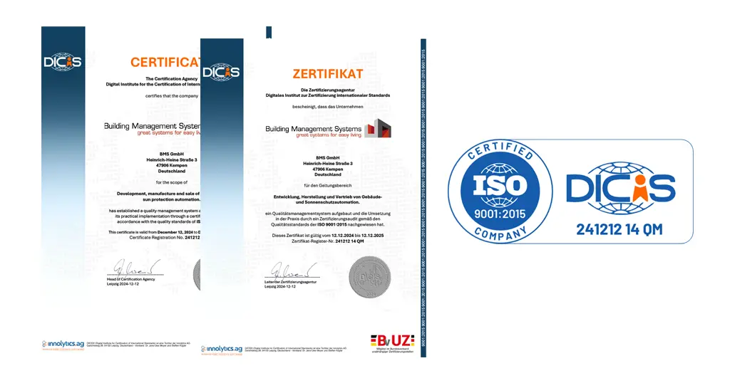 Neben unserer ISO 9001 Zertifizierung erfüllen wir alle relevanten internationalen Standards für KNX-Sonnenschutzsysteme, darunter KNX®-Konformität, SMI-Schnittstellen sowie CE-Kennzeichnung. Diese Zertifizierungen garantieren, dass unsere Produkte sicher, zuverlässig und kompatibel mit weltweiten Gebäudesteuerungssystemen sind.