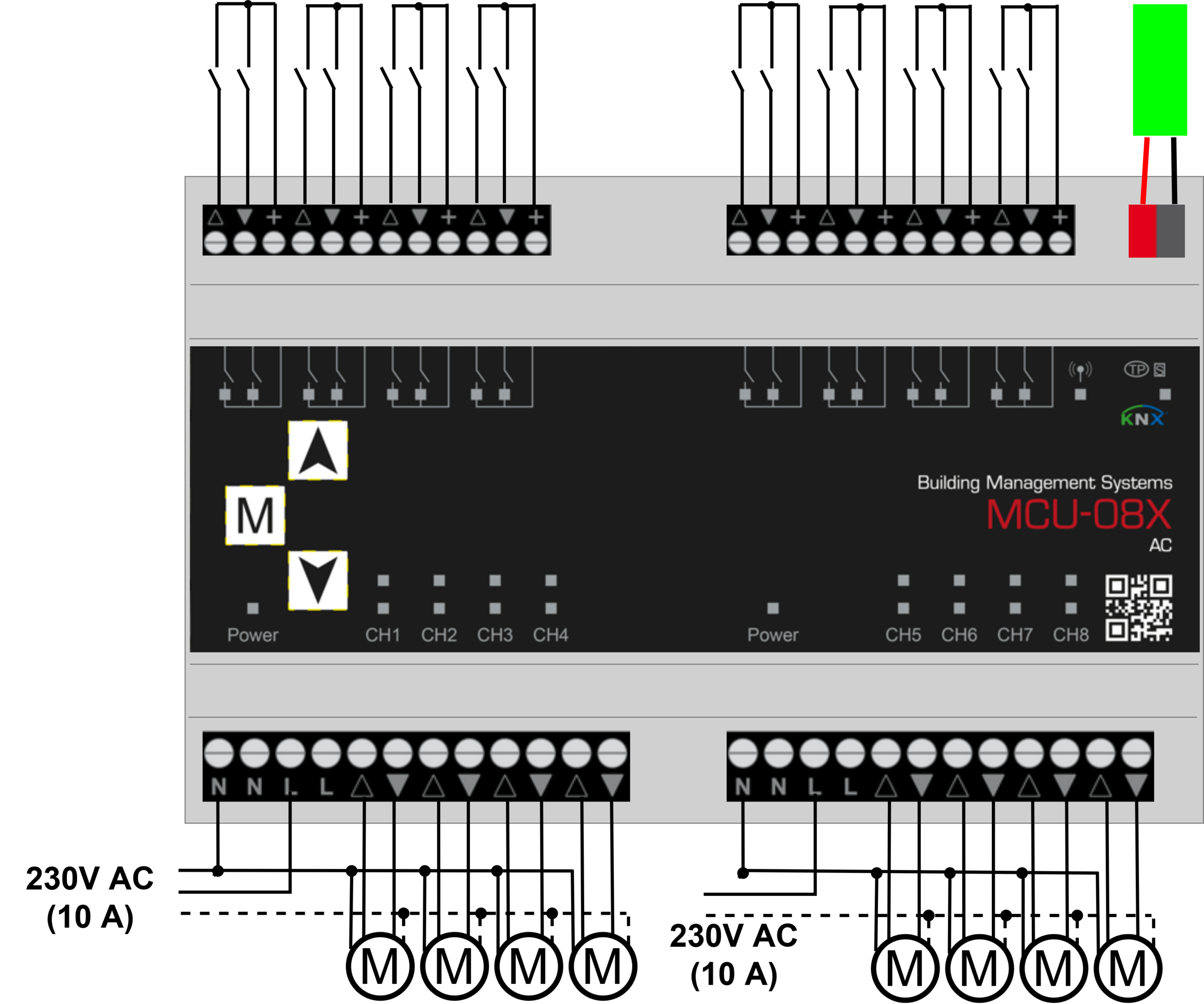 Der MCU-08X AC ist ein leistungsstarker 8-fach Jalousieaktor zur Steuerung von 230V AC Antrieben mit zwei Endschaltern pro Kanal. Er wurde speziell für anspruchsvolle Gebäudeautomation entwickelt und bietet höchste Flexibilität bei der Steuerung großer Sonnenschutzanlagen.